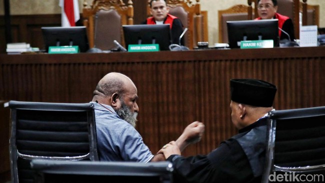 "Yang Mulia ketua majelis hakim dan anggota, apa yang dibacakan itu tidak benar semua," jawab Lukas Enembe sambil menunjuk ke arah jaksa KPK.
