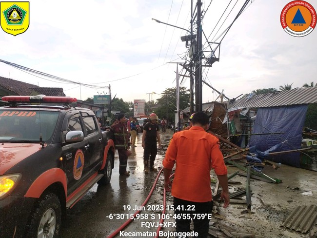 "Kejadian angin kencang di Sukajaya, mengakibatkan 18 rumah terdampak dan alami kerusakan. Kemudian di Setu Kemuning Bojonggede ada 3 toko rusak akibat tersapu angin. Selanjutnya angin kencang di Cibinong, sekitar Pakansari ada pohon tumbang. Korban jiwa nihil, hanya materi," kata Jalal, Senin (19/6/2023).