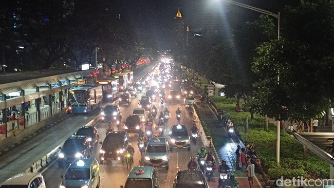 Pantauan detikcom, Senin (19/6/2023), pukul 21.41 WIB, kemacetan tampak terjadi di Jalan Jenderal Sudirman. Kendaraan tampak banyak keluar dari Jalan Pintu Satu Senayan.