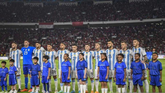 Pantauan detikcom di GBK, Senin (19/6/2023), tampak para pemain Timnas Indonesia dan Argentina keluar dari lorong. Terlihat Martinez keluar dengan menggandeng Jan Ethes.