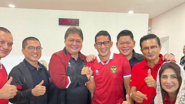 Di foto kedua, Sandiaga tampak salam komando dengan Airlangga yang menggunakan jersei Timnas berwarna hitam dan jaket. bersama beberapa orang lainnya. Di sebelah Sandiaga tampak Wakil Ketua MPR Fadel Muhammad.