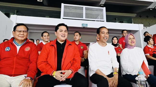 Pantauan detikcom, Senin (19/6/2023), Jokowi menonton pertandingan persahabatan itu dengan mengenakan kaus putih. Di sebelah kirinya, duduk Ibu Negara Iriana. Sedangkan di sebelah kanannya, duduk Erick Thohir dan Prabowo Subianto.