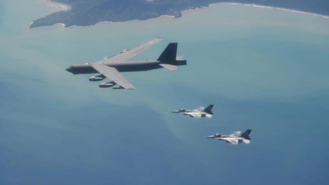 Dua pesawat pengebom (bomber) milik Angkatan Udara Amerika Serikat (United State Air Force/USAF) jenis B-52 Stratofortress masuk wilayah Indonesia. Pesawat bomber AS itu terus dibuntuti 3 pesawat tempur F-16 TNI AU hingga mendarat di Medan.