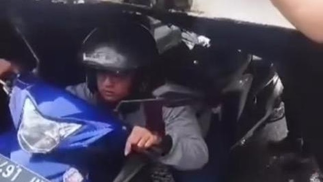 Dari video yang beredar, seperti dilihat Selasa (20/6/2023), tampak sejumlah pria mendorong motornya di bawah kolong kontainer. Mereka mendorong motornya perlahan-lahan.