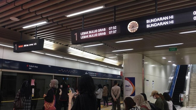 detikcom mengunjungi Stasiun Dukuh Atas BNI pada Kamis (22/6/2023) pukul 08.00 WIB. Tampak antrean untuk tap-in di Stasiun Dukuh Atas BNI.