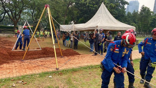 Pantauan detikcom di TPU Menteng Pulo, Tebet, Jakarta Selatan (Jaksel), Kamis (22/6/2023), pukul 13.36 WIB, terlihat Damkar tengah mempersiapkan prosesi pemakaman Fajri ke liang lahad. Tampak tripod dan tali karmantel dipasang Damkar di dekat liang lahad Fajri.