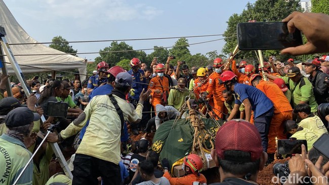 Pantauan detikcom di TPU Menteng Pulo, Tebet, Jakarta Selatan (Jaksel), Kamis (22/6/2023), terlihat petugas Damkar dan Basarnas menarik tali yang tersambung dengan tripod. Jenazah Fajri kemudian diturunkan ke liang lahad diiringi lantunan Surat Yasin.