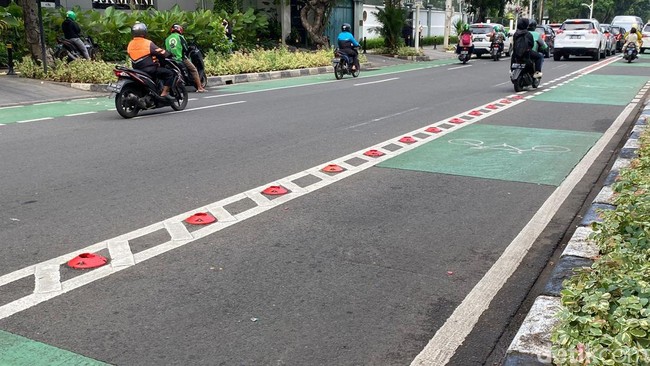 Kondisi jalur sepeda di sejumlah ruas jalan DKI Jakarta kehilangan pembatas atau stick cone yang memisahkan dengan kendaraan bermotor. Salah satu stick cone jalur sepeda yang hilang berada di Jalan Sabang, Jakarta Pusat.