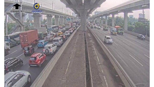 Kemacetan terjadi di ruas Tol Tambun arah Jakarta. Kemacetan terjadi karena ada proyek perbaikan jalan.
