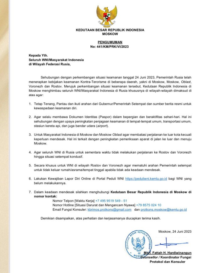 "Sehubungan dengan perkembangan situasi keamanan tanggal 24 Juni 2023, pemerintah telah menerapkan kebijakan keamanan kontra-terorisme di beberapa daerah, yakni di Moskow, Oblast Voronezh dan Rostov. Merujuk situasi kemanan tersebut, Kedutaan Republik Indonesia di Moskow mengimbau seluruh WNI/masyarakat Indonesia di Rusia khususnya di wilayah-wilayah dimaksud di atas," tulis isi surat tersebut.