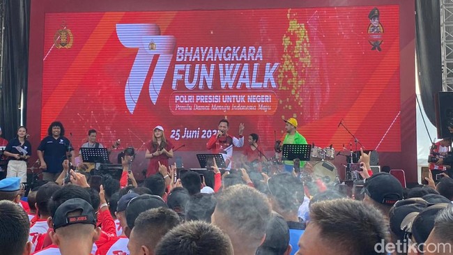 Polri menggelar acara Bhayangkara Fun Walk di Monas, Jakarta Pusat, dalam menyambut Hari Bhayangkara ke-77 mendatang. Di momen tersebut, Kapolri Jenderal Listyo Sigit Prabowo turut memeriahkan acara dengan menyanyi di panggung.