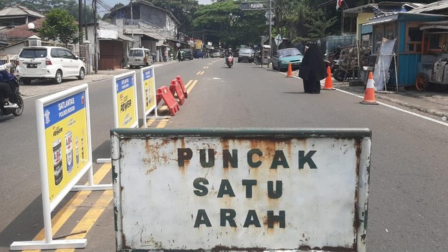 Satlantas Polres Bogor menerapkan sistem satu arah atau one way arah Jakarta di Jl Raya Puncak, Bogor, Jawa Barat (Jabar). Arus kendaraan menuju Puncak, Bogor, untuk sementara dihentikan.