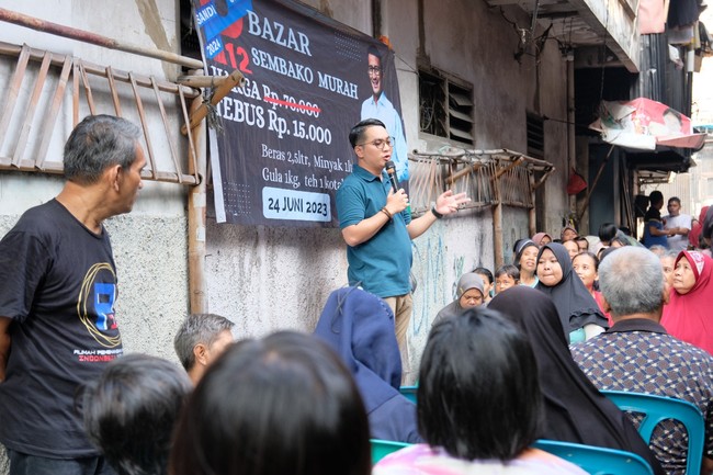 Relawan Sandiaga Uno yang tergabung dalam UMKM Sahabat Sandi Uno Jakarta Barat bersama P12 (Rumah Pemenangan Sandi Uno) menyediakan ratusan paket sembako murah. Bantuan ini diberikan untuk masyarakat di Jl Pekapuran, Kecamatan Tambora, Jakarta Barat guna menekan harga bahan pokok dan mengatasi kenaikan harga sembako.