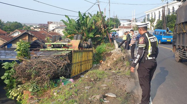 Truk muatan ranting pohon mengalami kecelakaan tunggal di Jalan Raya Ciampea, Ciampea, Kabupaten Bogor, Jawa Barat. Dua orang meninggal akibat kecelakaan tersebut.