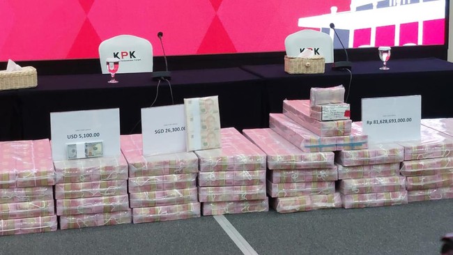 Pantauan detikcom, Senin (26/6/2023), ada Rp 81.628.693.00 atau Rp 81,6 miliar uang pencucian uang dari Lukas Enembe yang diperlihatkan oleh KPK. Tumpukan uang itu dipamerkan di depan panggung.