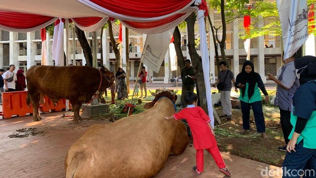 Sapi kurban milik Presiden Joko Widodo dan Wakil Presiden Ma'ruf Amin di Masjid Istiqlal menjadi tontonan warga saat bubaran salat Idul Adha. Warga mengaku penasaran ingin melihat langsung hewan kurban dari Jokowi dan Ma'ruf Amin.
