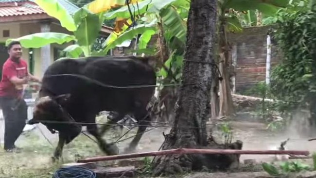 Sapi itu lepas saat hendak disembelih. Sapi terlepas karena hanya diikat menggunakan tambang kecil.