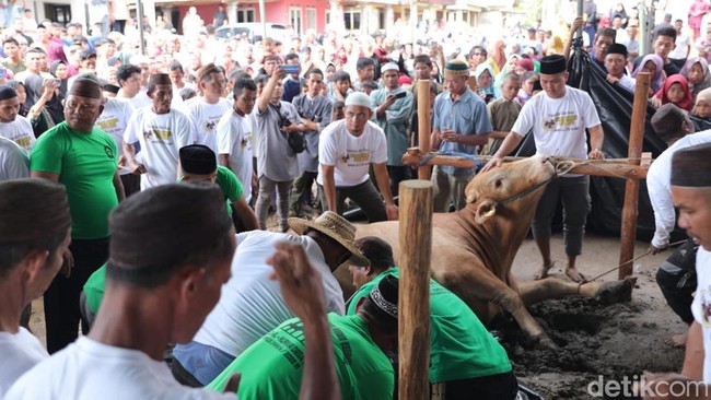 Warga ramai-ramai menonton pemotongan sapi kurban milik Presiden Joko Widodo (Jokowi) di Bangka Belitung (Babel). Sapi jenis limosin dengan berat 1,059 ton itu diserahkan ke warga Desa Kace, Kecamatan Mendo Barat, Kabupaten Bangka.