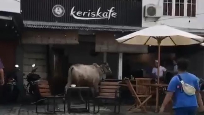 Terlihat pengunjung di sekitar 'Keris Kafe' berlarian. Sapi itu menabrak kursi hingga meja yang ada di restoran. Ia juga terlihat masuk sampai ke dalam bar kafe.