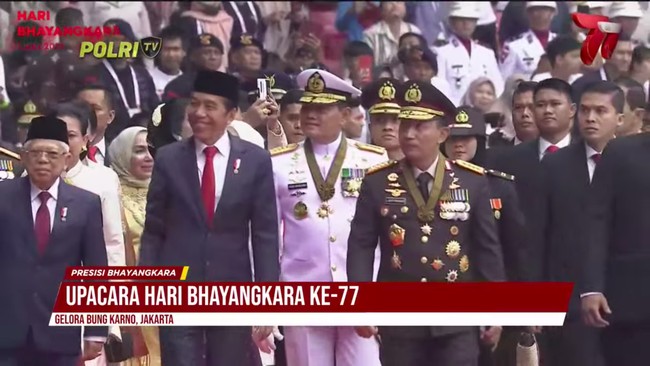 Upacara Hari Bhayangkara ke-77 di Stadion Utama Gelora Bung Karno (SUGBK) dimulai. Presiden Joko Widodo (Jokowi) bertindak sebagai inspektur upacara (irup).