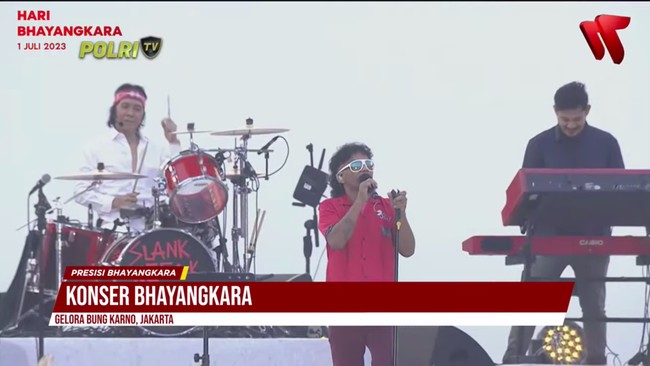 Pantauan detikcom, Sabtu (1/7/2023), awalnya Slank menghibur hadirin peserta Upacara Hari Bhayangkara ke-77 di Stadion GBK dengan lagu berjudul Mars Slanker.