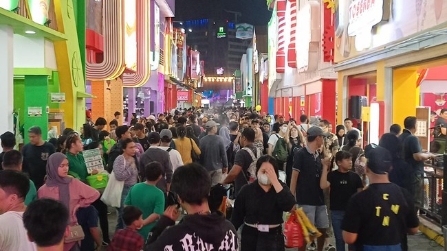 Sedangkan di dalam area PRJ, pengunjung terlihat padat. Sejumlah antrean pun terlihat berada di sejumlah stan. Beberapa pengunjung pun ada yang duduk-duduk di lantai.