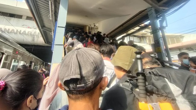 Pantauan detikcom di Stasiun Tanah Abang, Senin (3/6/2023) pukul 08.55 WIB antrean mulai terlihat saat penumpang turun dari gerbong kereta arah Manggarai. Antrean naik tangga ke arah peron 5 dan 6 dengan tujuan Serpong juga padat.