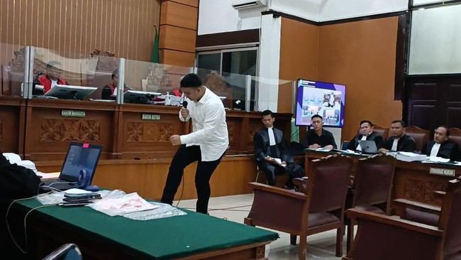Terdakwa kasus penganiayaan Cristalino David Ozora (17), Shane Lukas (19), memperagakan ulang cara terdakwa Mario Dandy Satriyo menendang kepala David. Dia sebelumnya meminta izin kepada hakim untuk memeragakan di muka persidangan.