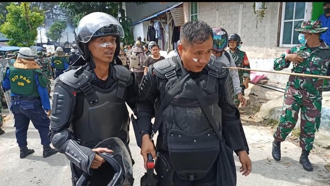 Petugas gabungan yang terdiri dari kepolisian, TNI, Satpol PP, dan Ditpam BP Batam berusaha meredam masyarakat. Namun warga terus melempar batu ke arah petugas.