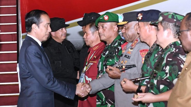 Presiden Jokowi bersama rombongan tiba di Bandara Sentani, Jayapura, Papua, sekitar pukul 18.37 WIT. Tampak menyambut kedatangan Kepala Negara adalah Menteri Dalam Negeri Tito Karnavian, Kepala BIN Jenderal Polisi (Purn) Budi Gunawan, Plh Gubernur Papua Ridwan Rumasukun, Pangkogabwilhan III Letjen TNI Agus Suhardi, Pangdam XVII/Cendrawasih Mayjen TNI Izak Pangemanan, Kapolda Papua Irjen Mathius D Fakhiri, Pangkoarmada III Laksamana Muda Rachmad Jayadi, dan Pangkoops AU III Marsekal Muda TNI Donald Kasenda.