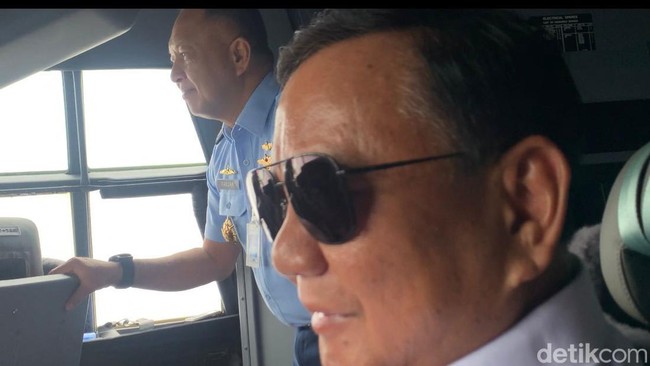 Prabowo dan Marsekal Fadjar Prasetyo duduk di ruang kokpit pesawat, tepat di belakang kursi pilot. Terlihat Prabowo tampak menikmati penerbangan ini mengenakan kacamata hitam.