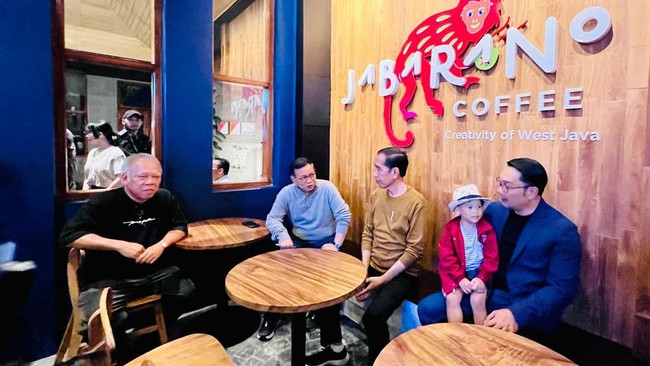 Jokowi juga singgah di salah satu kedai kopi bersama Ridwan Kamil, yang tampak membawa putra bungsunya. Beberapa menteri juga terlihat mendampingi, yakni Menteri PUPR Basuki Hadimuljono, Menteri BUMN Erick Thohir, dan Sekretaris Kabinet Pramono Anung.