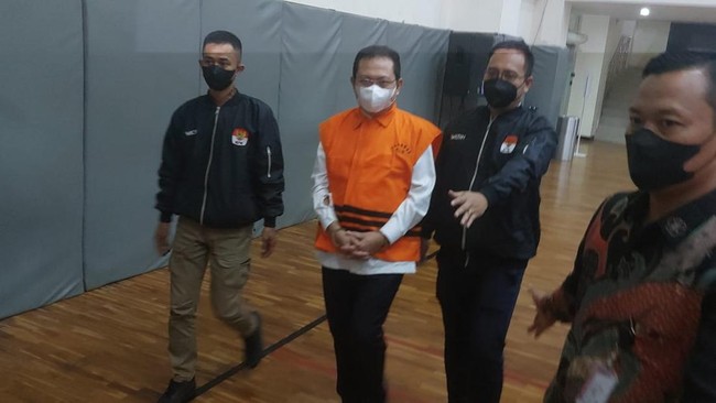 Pantauan detikcom, Rabu (12/7/2023), Hasbi Hasan telah menggunakan rompi tahanan berwarna oranye. Tangannya pun telah diborgol.
