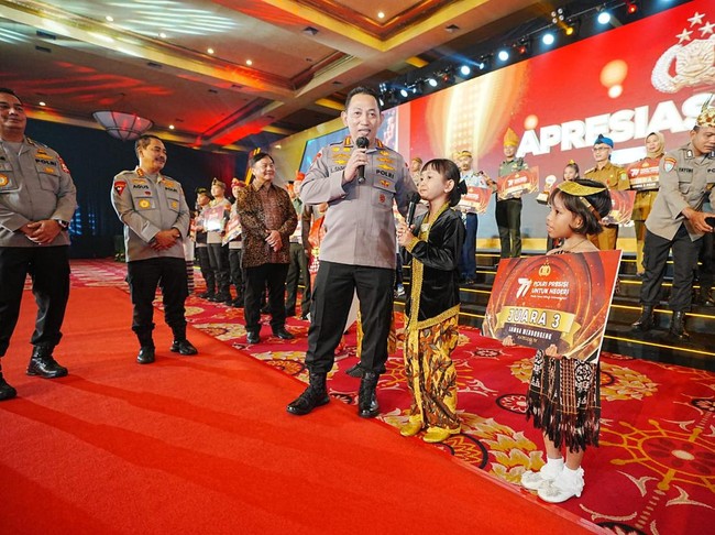 "Ada hal yang menarik terkait dengan kegiatan kali ini, karena diikuti mulai dari anak TK, kemudian sampai dengan dewasa, kemudian masyarakat sampai dengan ada TNI dan juga Polri, dan juga tentunya ada beberapa jenis kegiatan lomba di mana di dalamnya lomba terkait dengan kreasi-kreasi pelayanan-pelayanan kepolisian, fungsi-fungsi kepolisian," jelas Sigit di Balai Samudera, Jakarta, Rabu (12/7/2023) malam.
