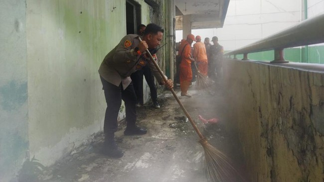Petugas gabungan yang terdiri dari Polsek Tanah Abang, Babinsa TNI, perangkat kelurahan Kebon Kacang mulai membersihkan Gedung blok G pasar Tanah Abang. Kegiatan bersih-bersih dilakukan mulai dari lantai dasar.