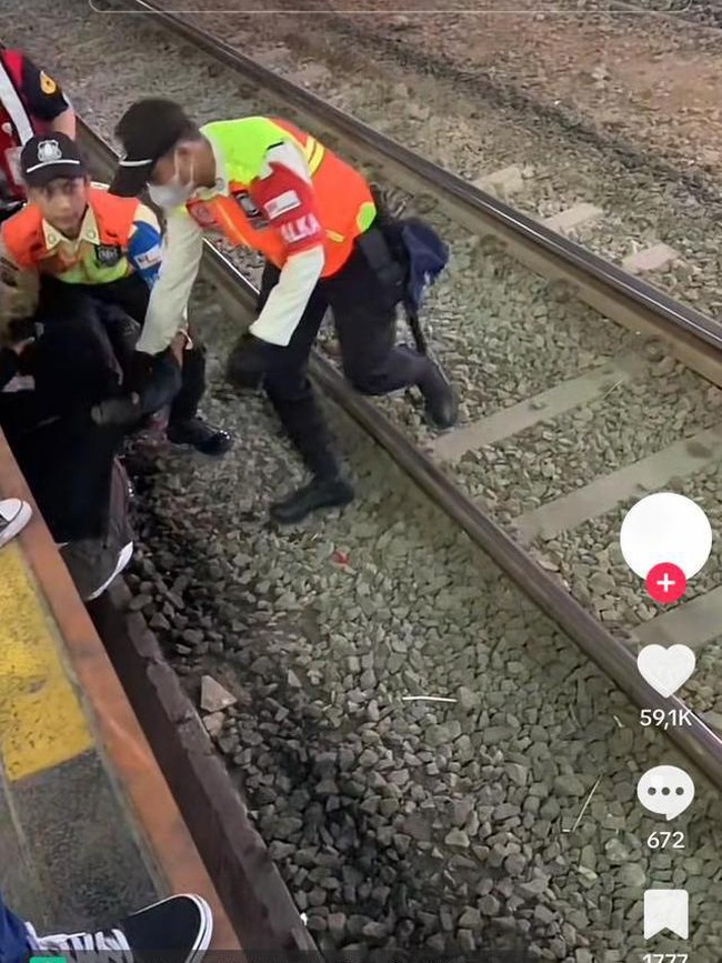 Kembali ke video, petugas stasiun terlihat memegangi wanita itu. Wanita tersebut tampak sempoyongan.
