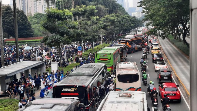 Kemacetan parah terjadi di Jalan Sudirman, Jakarta Pusat menuju arah Jalan Gatot Subroto. Kemacetan didominasi oleh bus kader NasDem yang usai menghadiri Apel Siaga Perubahan.
