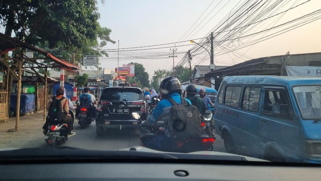 Pantauan detikcom, Senin (17/7/2023), pukul 06.50 WIB, kemacetan terjadi di ruas jalan menuju arah Jalan Pitara atau Jalan Margonda, Depok. Antrean kendaraan terlihat mengular menjelang SDN 2 Cipayung.
