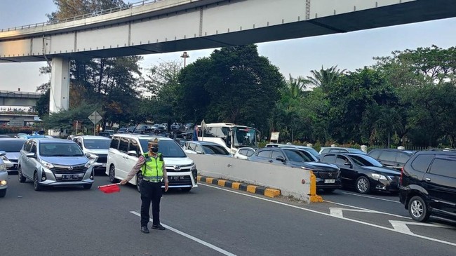 TMC Polda Metro mengunggah foto situasi di lokasi. Terlihat polisi memberhentikan kendaraan yang hendak mengarah ke Tol Janger.
