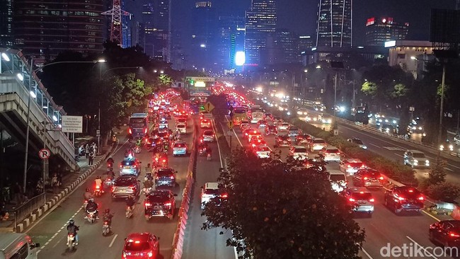 Pantauan detikcom di depan Polda Metro Jaya, pukul 19.40 WIB, Senin (17/7/2023), kemacetan terjadi di Tol Dalam Kota arah Cawang. Kendaraan roda empat tampak melaju perlahan.