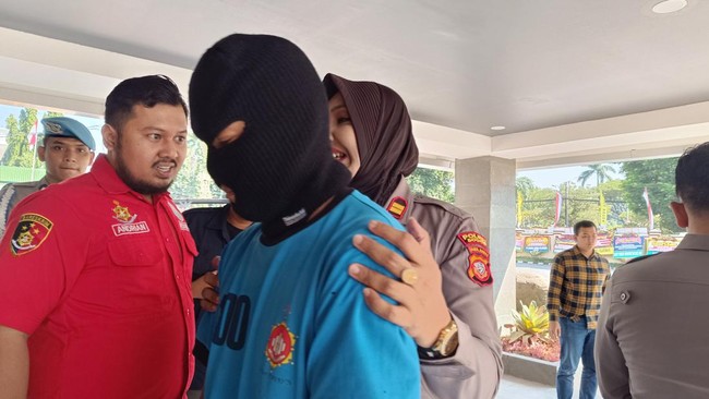 Pantauan detikcom di Mako Polres Bogor, Jalan Tegar Beriman, Cibinong, Bogor, tangan tersangka tampak diborgol. Dia mengenakan pakaian tahanan berwarna biru.