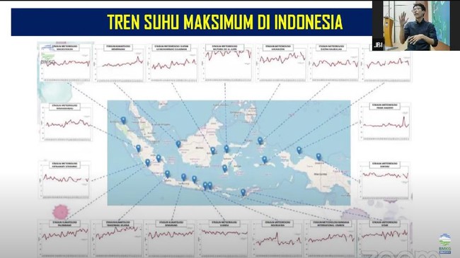 "Tren suhu maksimum di Indonesia bahwa kita melihat bahwa tadi disampaikan bahwa perubahan iklim sekarang sudah terjadi dan akan terus terjadi sehingga sehingga kita perlu mengantisipasi potensi-potensi yang muncul. Bapak-Ibu sekalian mungkin memperhatikan kondisi hujan lebat itu saat ini akan lebih sering terjadi dibandingkan beberapa tahun sebelumnya," tutur Hartanto.