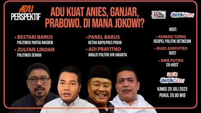 Malam Ini Adu Perspektif membahas topik 'Adu Kuat Ganjar, Anies, Prabowo, di Mana Jokowi?' bersama Bestari Barus (politikus Partai NasDem), Adi Prayitno (Direktur Eksekutif PPI), Zulfan Lindan (politikus senior), dan Panel Barus (Ketua Bapilpres Projo), Kamis, 20 Juli 2023, pukul 20.00 WIB. Acara disiarkan secara langsung dari kanal detikcom dan 20detik.