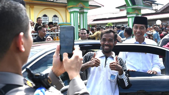 Warga terlihat heboh oleh kedatangan Jokowi. Sejumlah warga juga terlihat meminta berfoto bersama dengan Jokowi seusai salat Jumat.