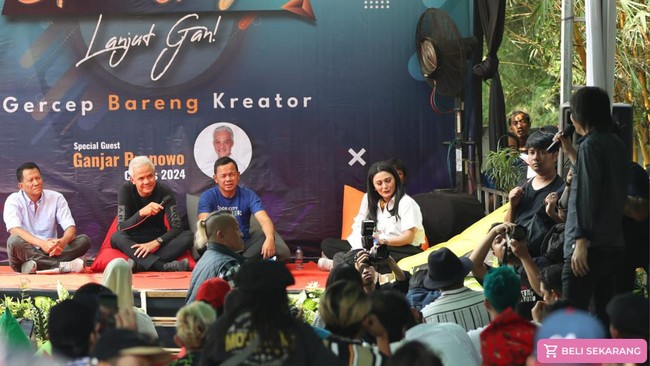 Bakal calon presiden dari PDIP Ganjar Pranowo menggelar diskusi dengan pelaku industri kreatif hingga musisi di Saung Berkah, Kabupaten Bogor, Jawa Barat. Isu royalti bagi musisi menjadi hal yang dibahas.