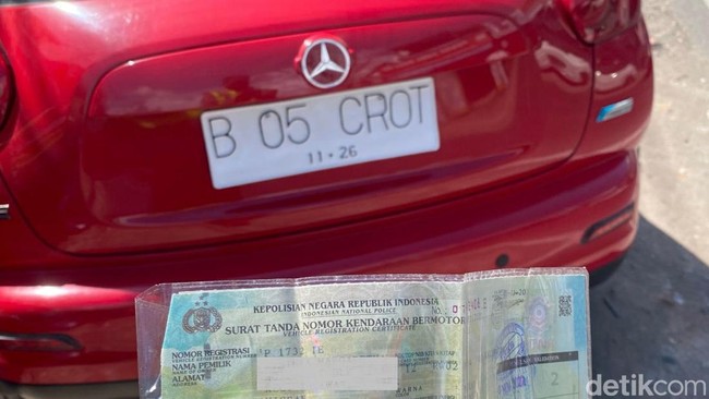 Selain pelat, Randy juga mengatakan logo Mercedes-Benz yang dipasang pemilik di belakang mobil juga palsu. Mobil tersebut ternyata bukan merek Mercedes-Benz, melainkan mobil Nissan Juke.
