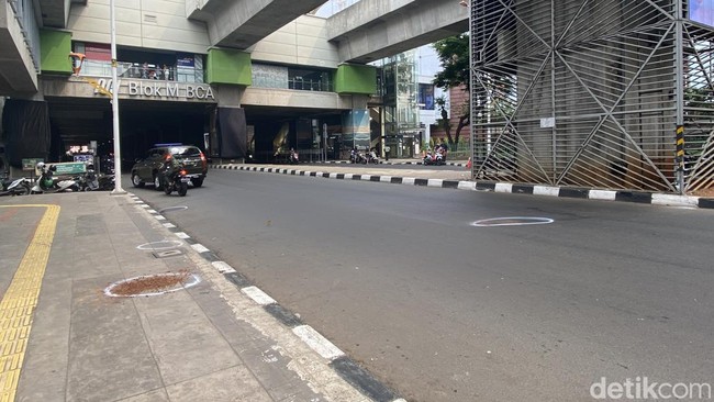 detikcom kemudian menyambangi TKP kecelakaan yang berlokasi di Jalan Panglima Polim arah Fatmawati, Minggu (23/7/2023). Pantauan sikitar pukul 13.54 WIB, terlihat ada 4 titik lingkaran yang dipiloks. Tampak di 2 lingkaran yang sejajar dengan tiang MRT masih ada bercak darah.
