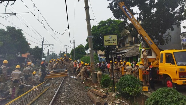 Salah satu petugas perbaikan tiang LAA, Wiwid (35), mengatakan proses perbaikan dilakukan dengan mengangkat tiang LAA yang rusak ditabrak truk. Dia mengatakan tiang sementara merupakan langkah awal perbaikan perjalanan KRL.
