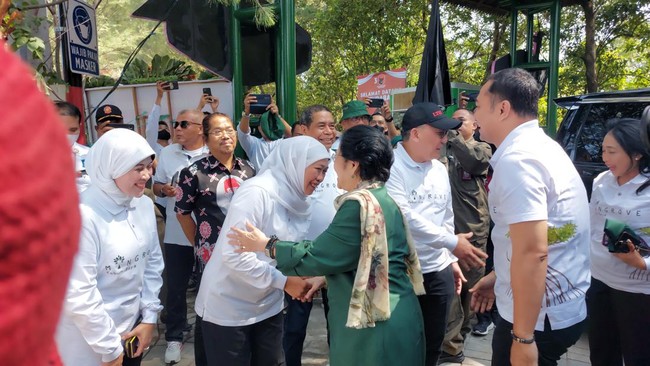 Pantauan detikcom di kawasan Kebun Raya Mangrove, Rabu (26/7/2023), Megawati tiba sekitar pukul 10.09 WIB. Dia datang mengenakan atasan berwarna hijau didampingin oleh Wali Kota Surabaya Eri Cahyadi.