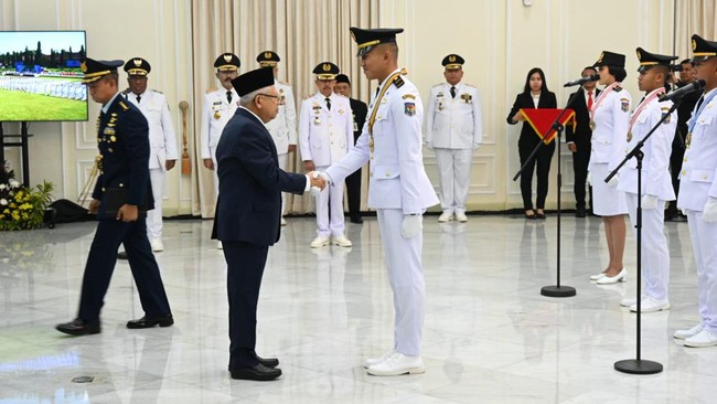 Pelantikan dilakukan di Istana Wakil Presiden, Jalan Medan Merdeka Selatan, Jakarta Pusat, yang disiarkan di YouTube Wapres RI, Kamis (27/7/2023). Ma'ruf mengucapkan selamat kepada para pamong praja muda itu.